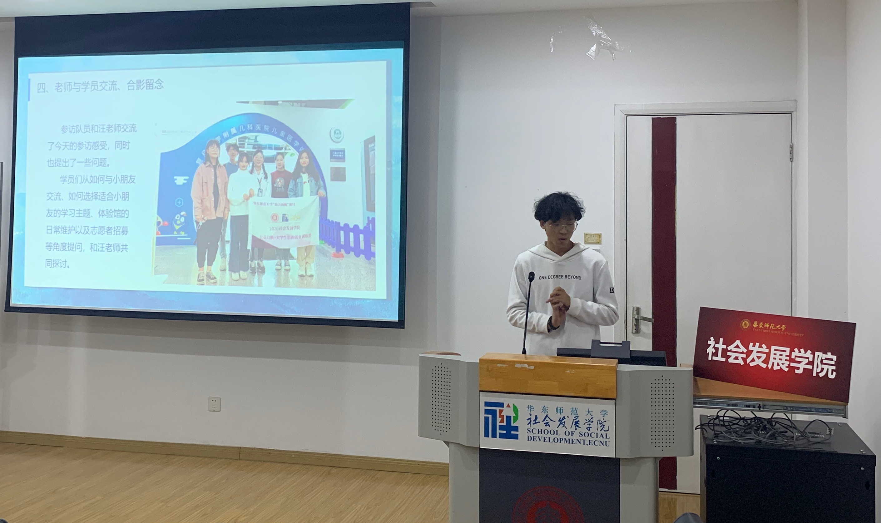 本次公益参访总结会的内容主要分为两部分,首先由各小组展示参访的过程,并针对所参观公益组织问题提出自己的想法,接着老师们对各参访组进行点评,共六组参访小队进行了汇报。