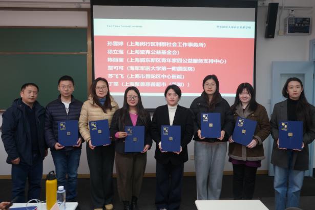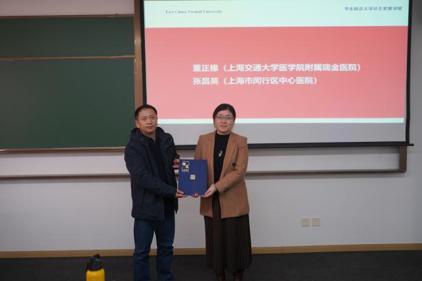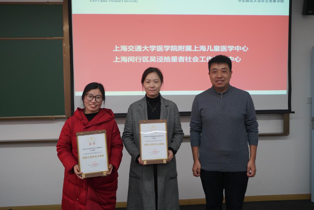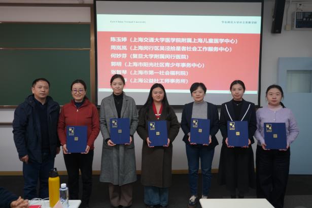 接下来,与会人员共同见证对优秀实习基地和校级示范性实习基地的表彰。社会工作系教师代表蒋潮鑫为上海闵行区吴泾拾星者社会工作服务中心、上海市阳光社区青少年事务中心、上海闵行区华漕铺路石青少年发展中心、上海市儿童医院、上海市闵行区中心医院共5家单位颁发了优秀实习基地荣誉证书。万国威为上海交通大学医学院附属上海儿童医学中心和上海闵行区吴泾拾星者社会工作服务中心颁发了2025年经本科生院认定的校级示范性实习基地证书。吴文钰代表学院向本年度聘任的校级和院级行业导师颁发了聘书。学院希望通过表彰与聘任,感谢实习基地在社会工作实务教学当中的贡献,回馈机构督导的付出,并表达未来携手共建的愿景。