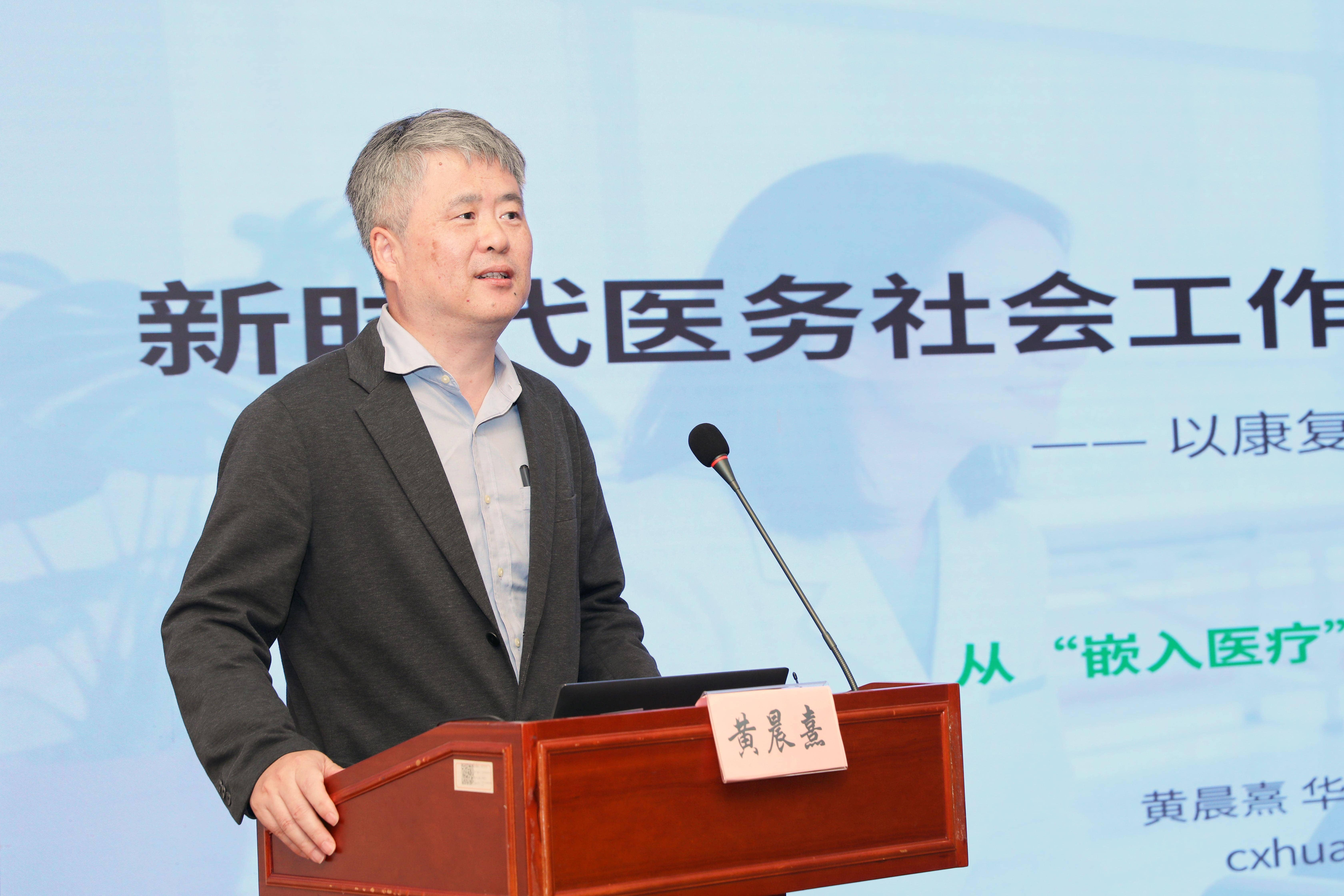 副院长黄晨熹教授与交通大学中国医院发展研究院健康社会工作研究所所长季庆英,复旦大学文科科研处处长顾东辉进行了发言。黄晨熹围绕新时代医务社会工作高质量发展的内涵和路径展开报告,他深刻解读了高质量发展的核心在于服务品质、专业效能与社会价值的全面跃升,并系统阐述了实现这一目标的四大路径:提升服务质量、深化制度嵌入、强化专业能力、彰显社会价值,为康复社工的规范化、专业化发展提供了清晰的理论框架与实践指引。